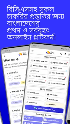 একটি অ্যাপেই আপনি বিসিএস, ব্যাংক, প্রাইমারি, এনটিআরসিএ, ৯ম-২০তম গ্রেড, বার কাউন্সিল, বিজেএস, বিশেষ বিসিএস, এনএসআই সহ বিভিন্ন গুরুত্বপূর্ণ পরীক্ষার প্রস্তুতি নিতে পারবেন। Live MCQ™ এর "পরীক্ষা সেকশন" আপনাকে দৈনিক লাইভ পরীক্ষায় অংশ নেওয়া এবং প্রতিটি প্রশ্নের বিস্তারিত ব্যাখ্যাসহ ফলাফল বিশ্লেষণের সুযোগ দেয়। অন্যদিকে, এর "স্টাডি সেকশন" সমৃদ্ধ করেছে অভিজ্ঞ শিক্ষকদের লাইভ ও রেকর্ডেড ভিডিও ক্লাস, পিডিএফ ও অডিও স্টাডি ম্যাটেরিয়াল, সমমনা সহপাঠীদের সাথে গ্রুপ অনুশীলন এবং রোমাঞ্চকর মাল্টি-প্লেয়ার কুইজ গেমের মাধ্যমে।